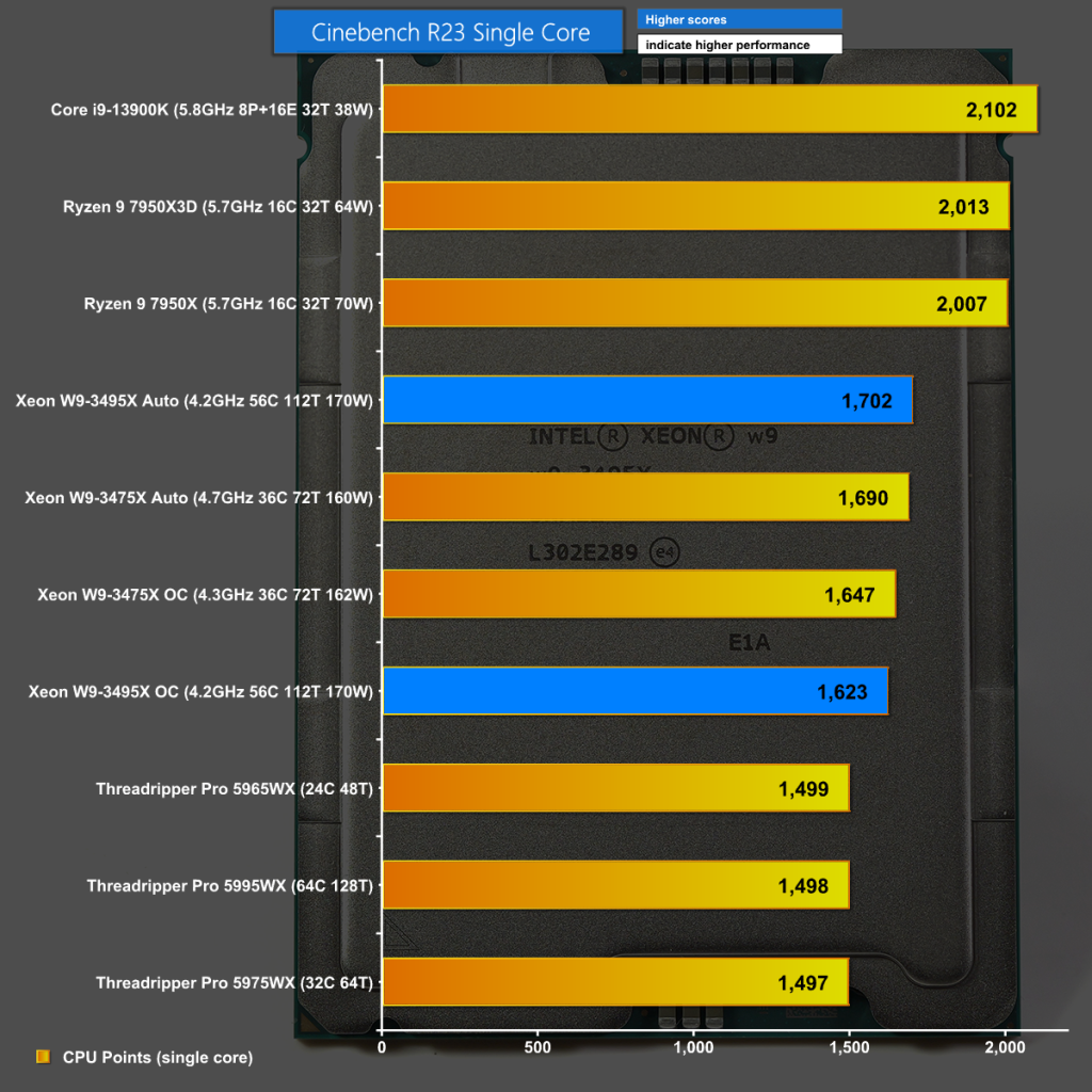 In Cinebench R23 we see the overclocked Xeon W9-3495X taking the win however on Auto settings the 64-core Threadripper Pro beats the 56-core Xeon by a narrow margin.