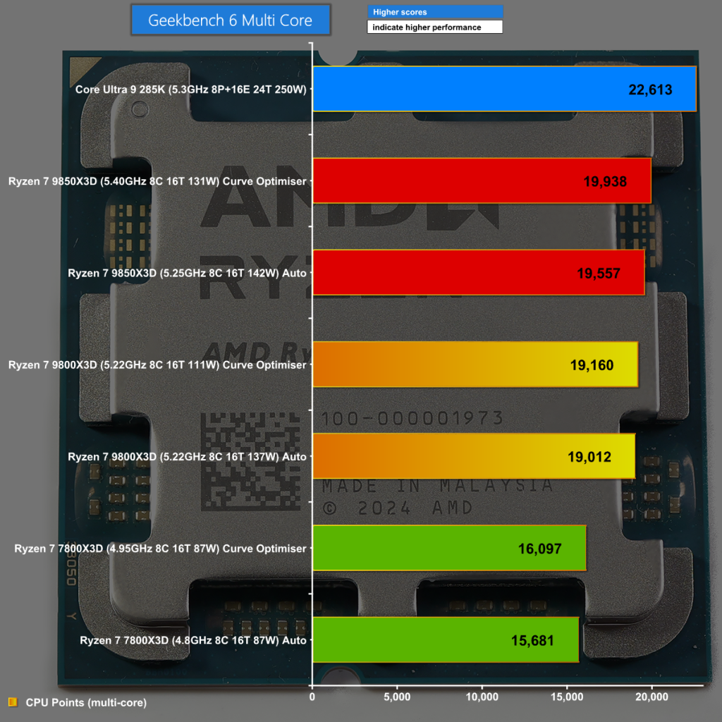 You will have seen in our video that we showed a great many charts and this chart is a focussed view of the larger Geekbench 6 chart. We can see the 9850X3D has a significant lead over 9800X3D and that is enhanced when we bring Ryzen Master Curve Optimiser into the equation.