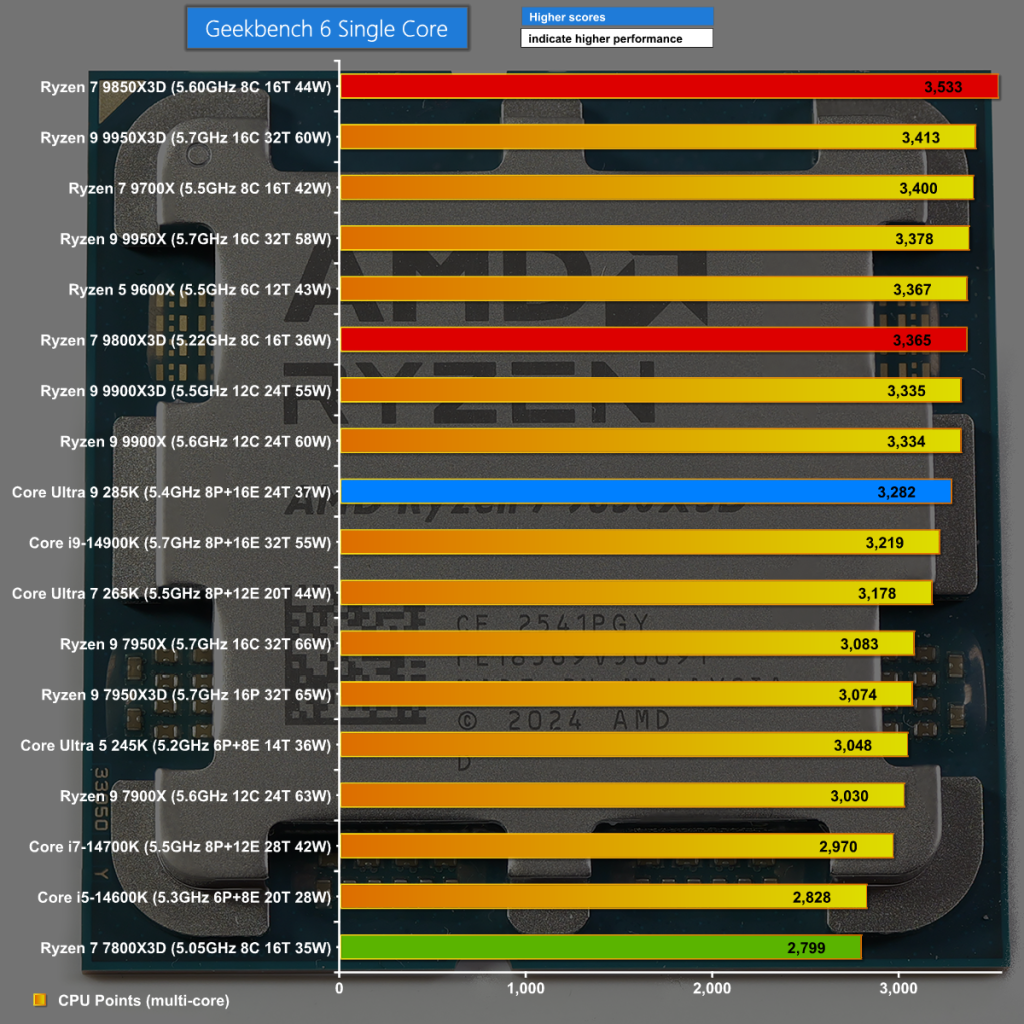 In Geekbench 6 Single Core we see the benefit of the improved boost speed with Ryzen 7 9850X3D leaping to the top of the chart.