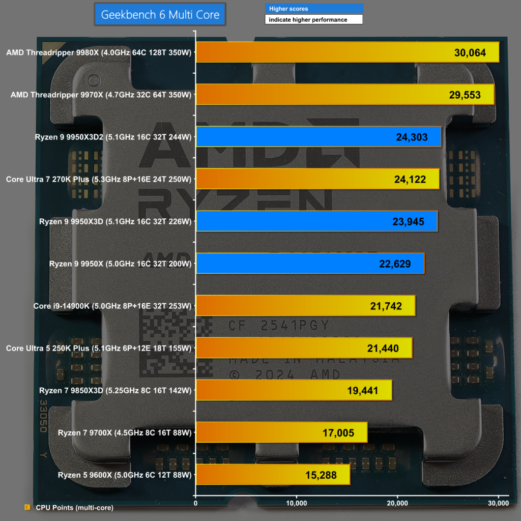 In Geekbench 6 Multi Core we see the mighty Threadrippers storm to the top of the chart. In third place – and the first of the regular desktop CPUs – it is the new Ryzen 9 9950X3D2 Dual Edition a small step ahead of the current Ryzen 9 9950X3D.
