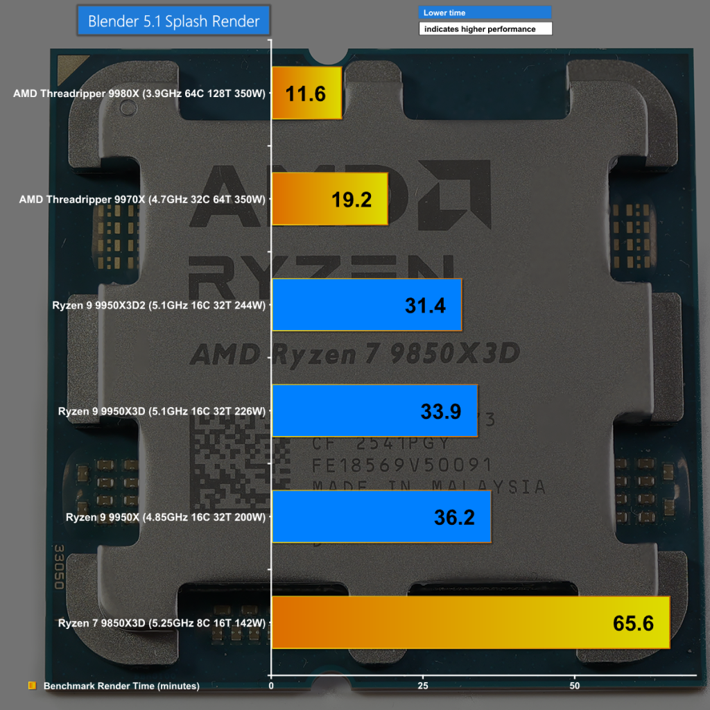 The Blender 5.1 Splash Render test is an intense workload that runs for over an hour on the Ryzen 7 9850X3D and still takes 11 minutes on the 64-core Threadripper 9980X. This test shows clear separation between the three Ryzen 9 9950 CPUs with the 9950X3D2 coming out on top.