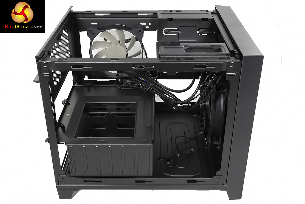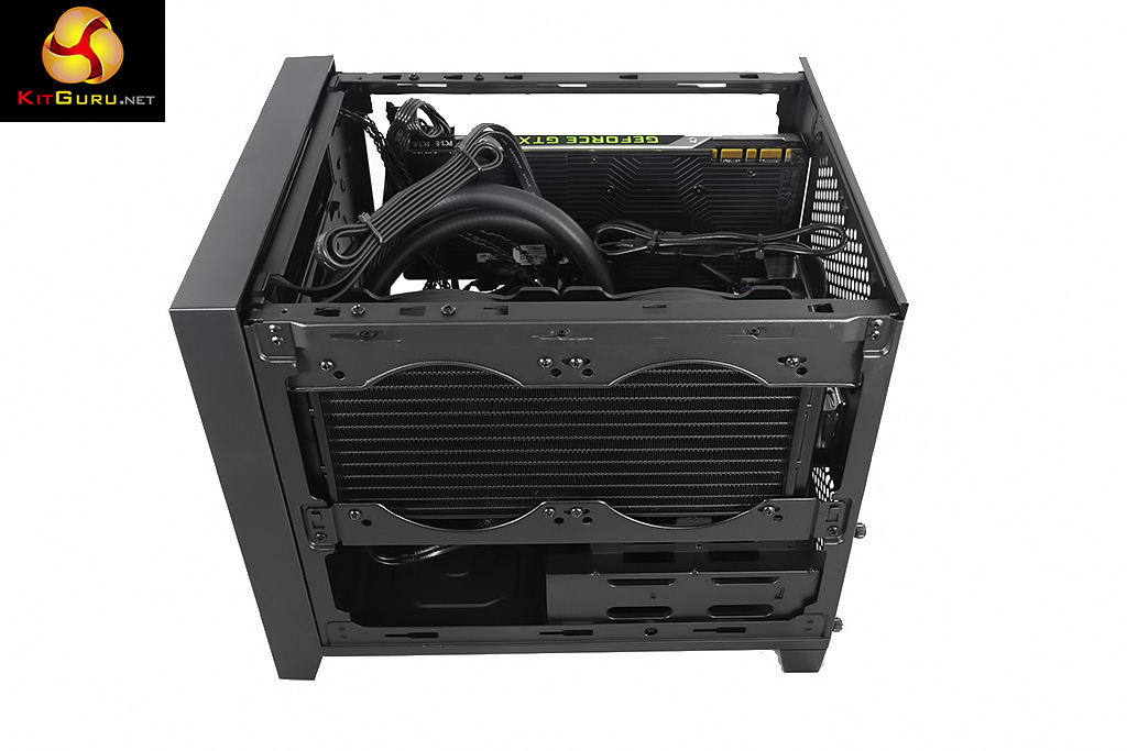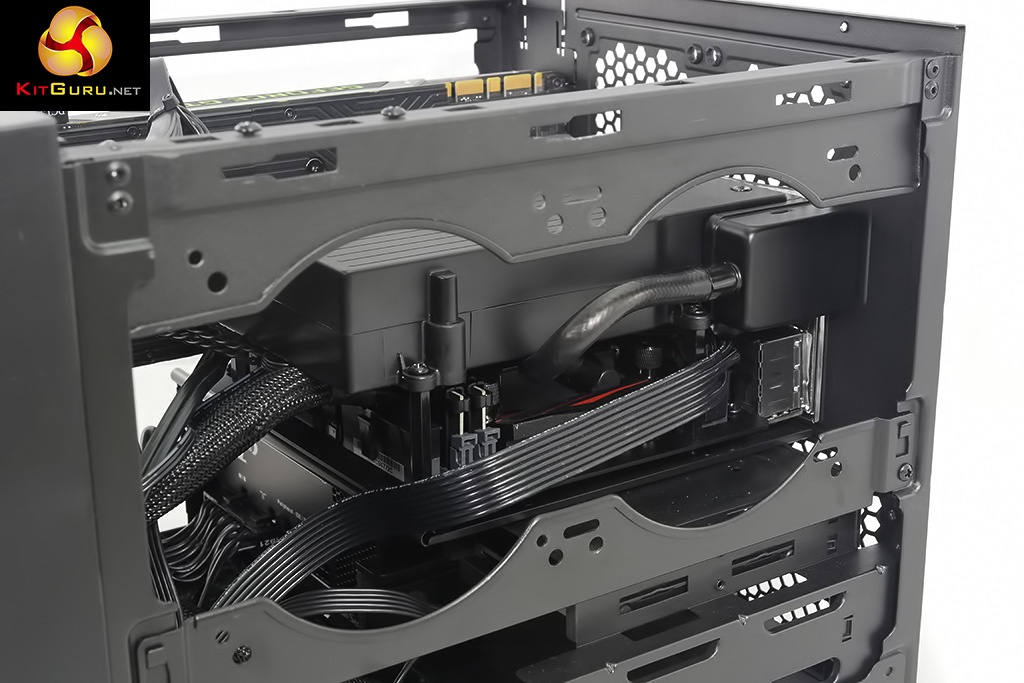 This is probably the most important feature of Corsair H5 SF as the cooler mounts on the motherboard, just like an air cooler, and the case merely acts as a cover and plays no part in supporting the cooling hardware. With a case such as Obsidian 250D this doesn't offer any obvious advantage but some small form factor cases, particularly HTPC style, don't give you anywhere to mount a 120mm fan unless you fix it to the top panel of the case. This can be awkward when you open the case as the panel is tethered by the coolant hoses.
