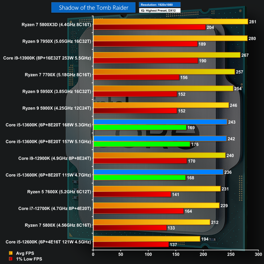 Firing up the elderly Shadow of the Tomb Raider at 1080p is interesting as the new Core i5 can directly compete with the Core i9-12900K and is hard on the heels of Zen 3 Ryzen 9.
