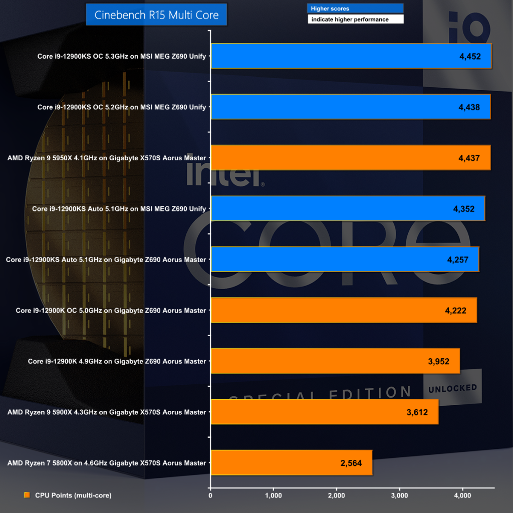Cinebench R15 Multi Core plays to the strengths of the overclocked KS which manages to beat the mighty Ryzen 9 5950X.