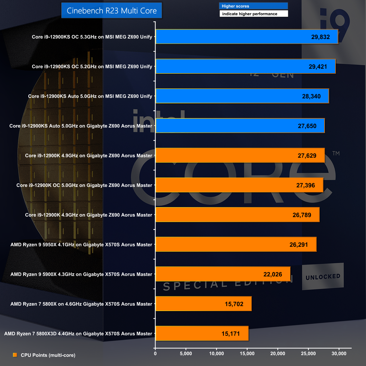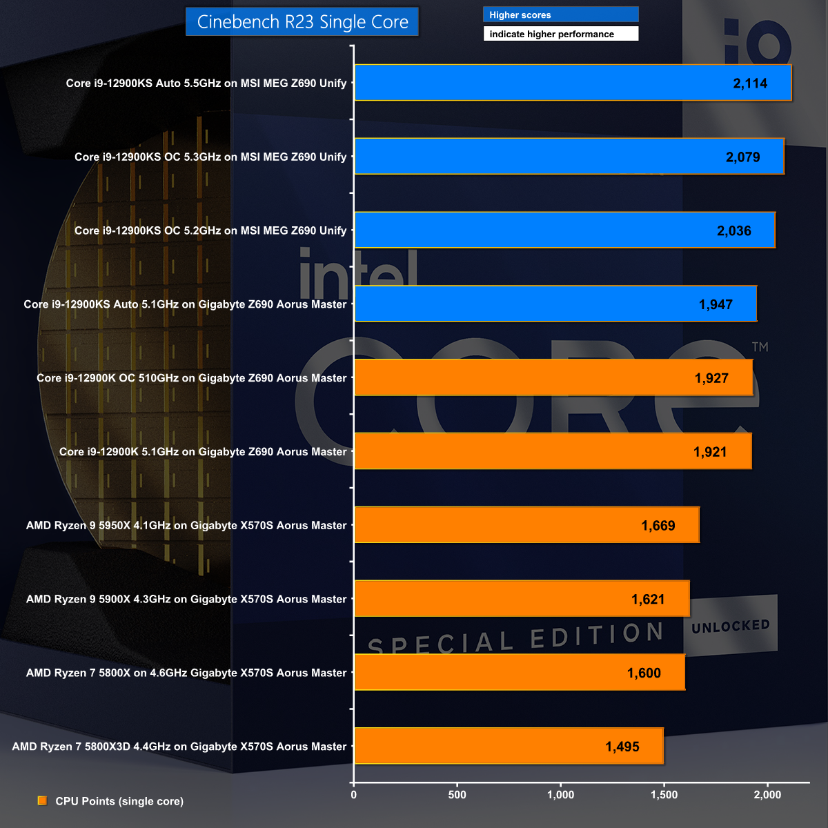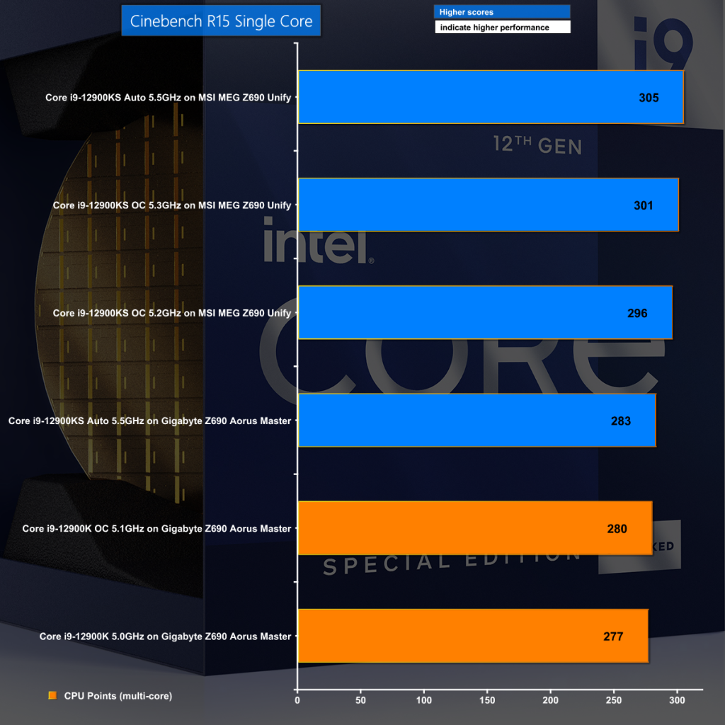The Cinebench R23 Single Core benchmark test shows the KS in the best possible light, crushing the competition with its huge Boost speed and galloping along at a furious pace.