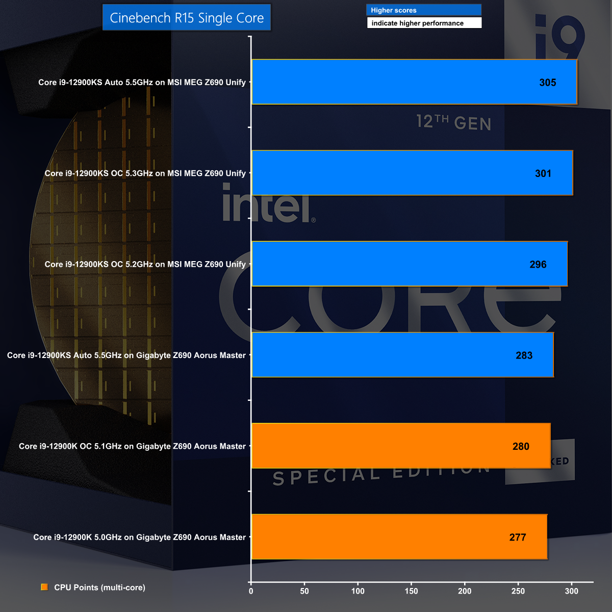 In Cinebench R15 Single Core the KS tops the chart on Auto settings thanks to its 5.5GHz clock speed.