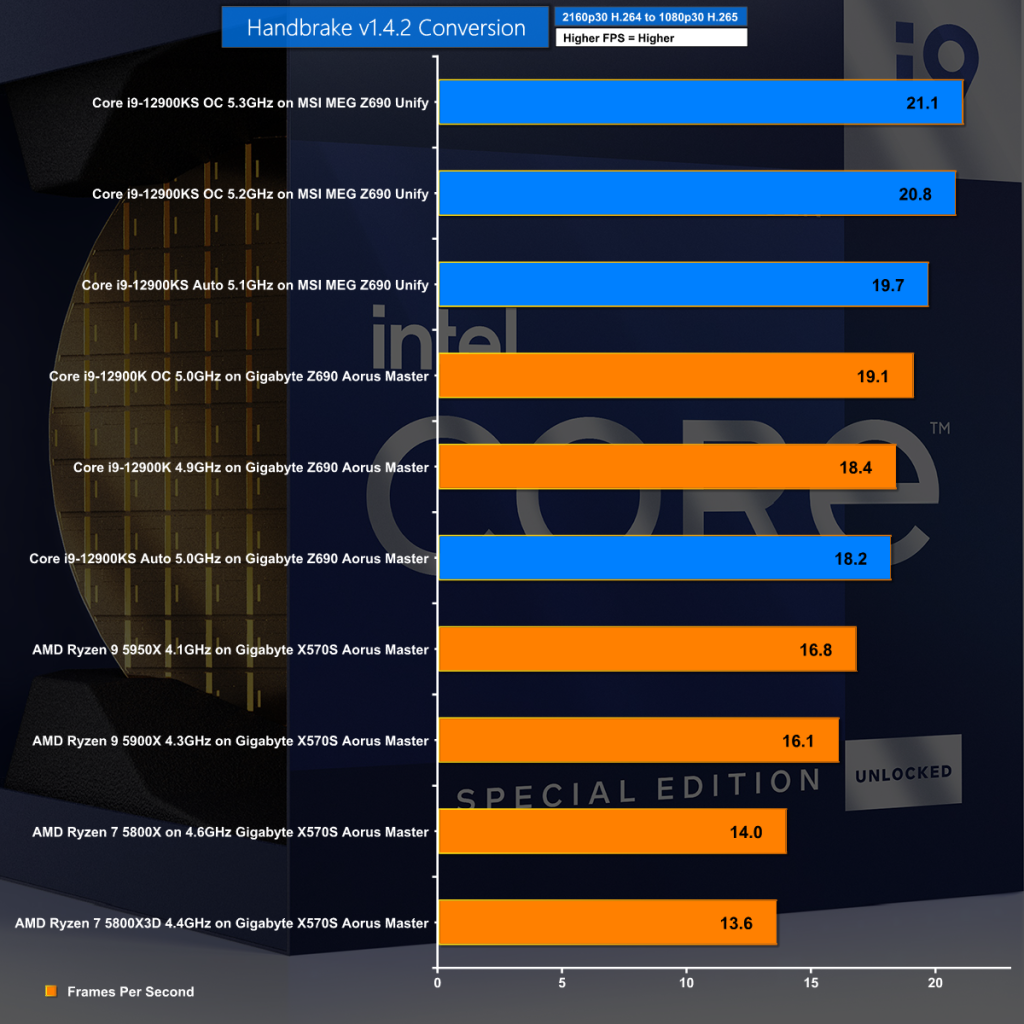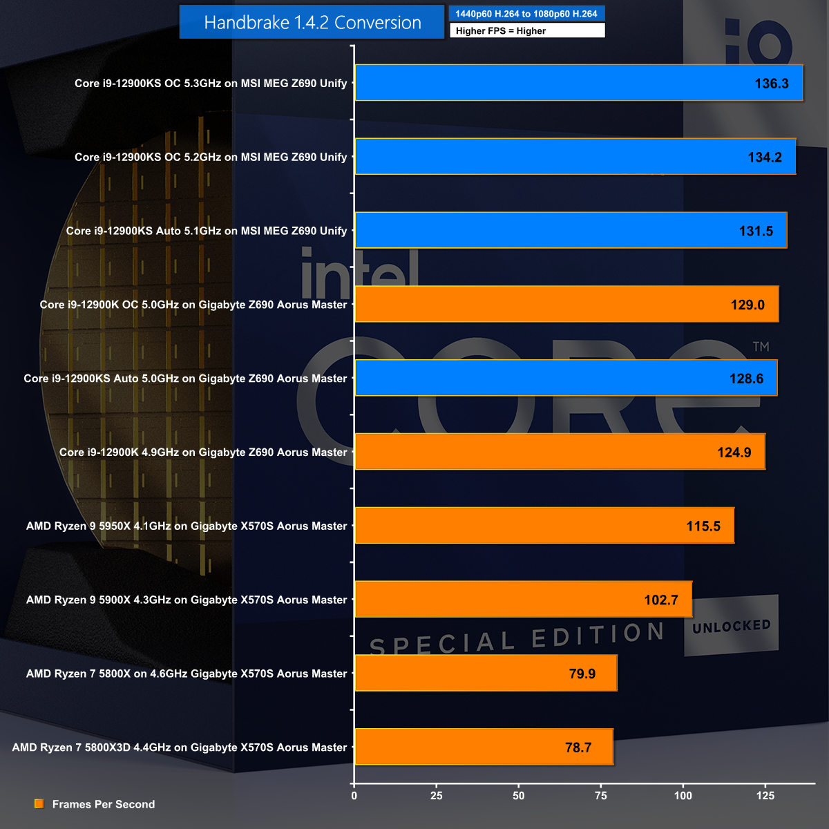 Our Handbrake H.265 chart is also dominated by the mighty overclocked KS running at 5.3GHz.