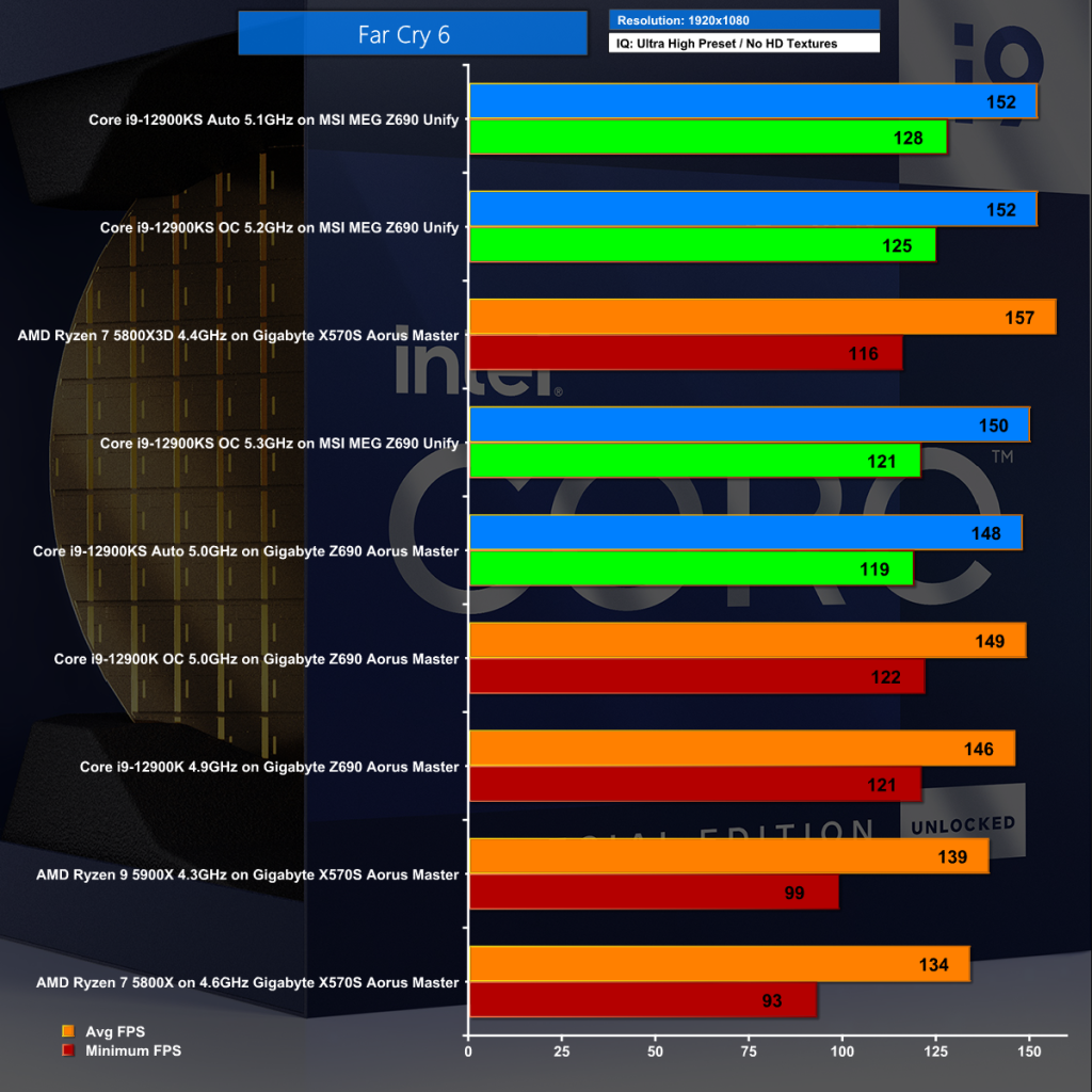 Our first gaming test is Far Cry 6 at 1080p which looks like a clear win for Intel, although the Ryzen 7 5800X 3D also makes a good showing.