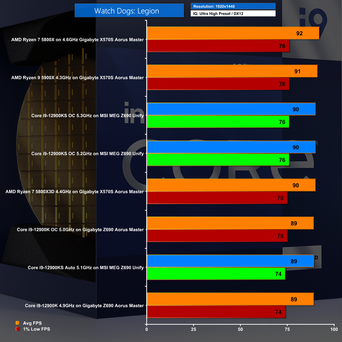 Watch Dogs: Legion at 1440p has the Ryzen 7 5800X at the top of the chart and Core i9-12900K at the bottom. We are only talking about 3fps difference from one end to the other so the fairest conclusion is that any of these CPUs will work quite nicely.