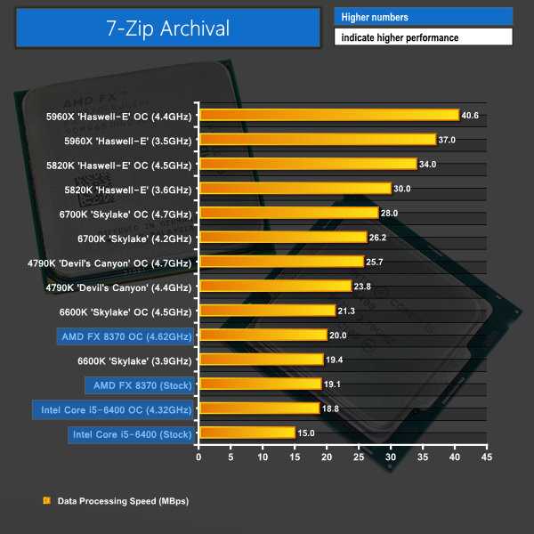 AMD's 8-core chip leads the way with file archival, but the margin of its performance lead is narrowed when a hefty overclock is applied to Intel's Skylake quad core.