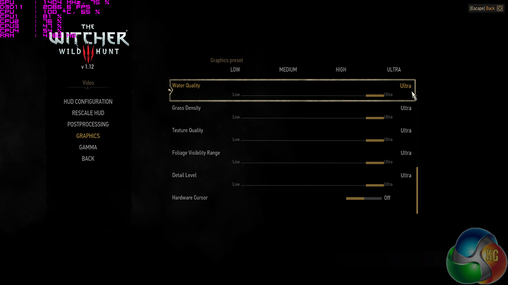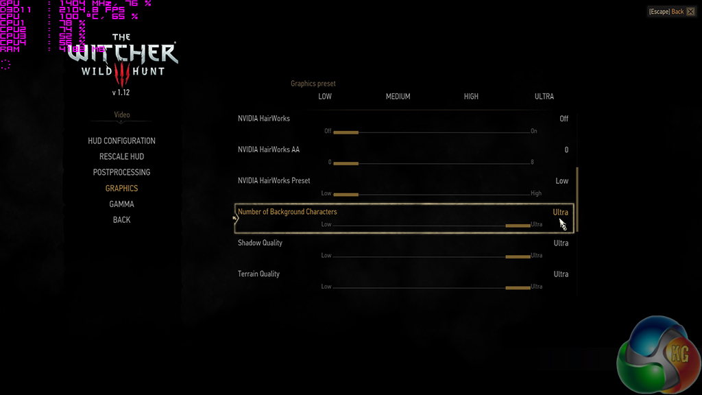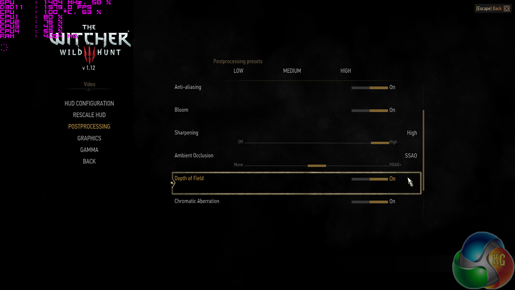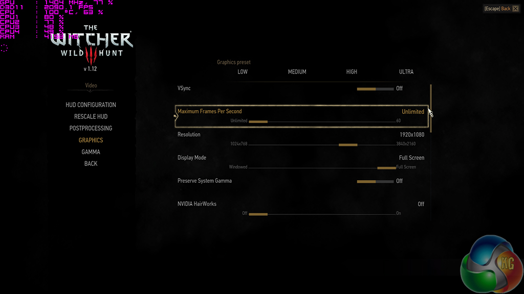Ultra settings were applied for The Witcher 3, with SSAO and Depth of Field enabled. A 1920×1080 resolution was selected.