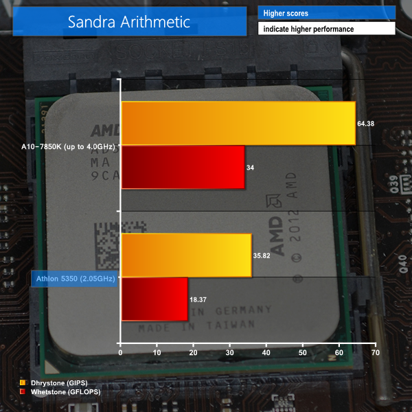 The Athlon 5350 delivers just over half the performance of AMD's A10-7850K in the Sandra Arithmetic test. Put into perspective, the Athlon 5350 is a 25W part versus the 95W TDP for the A10-7850K.