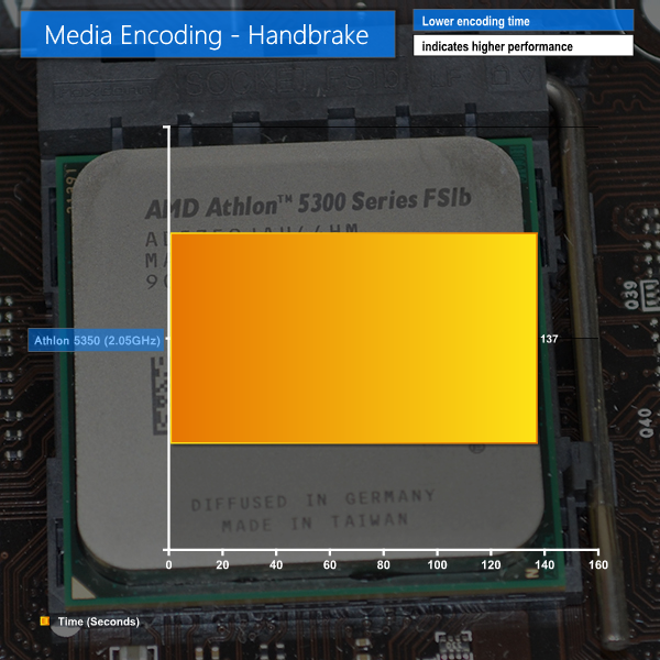 The Athlon 5350 manages to convert our 720P MKV file quicker than real-time. Averaging around 45 FPS (almost 2x speed), conversion of a hundred-minute film would be a lengthy wait.
