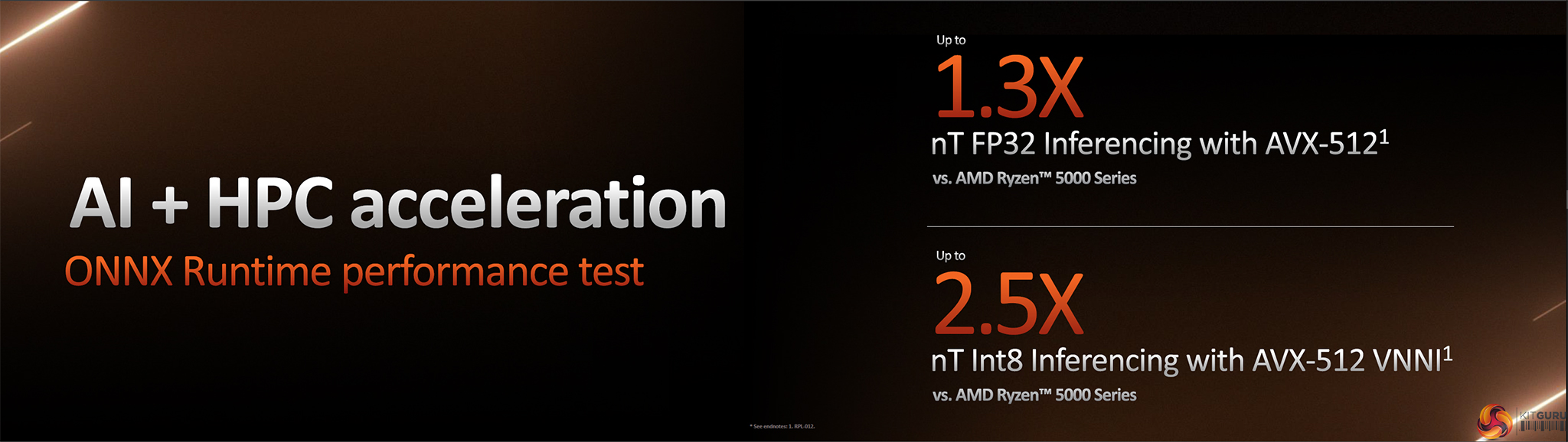 AVX-512 is now supported on Zen 4 to enhance the architecture’s abilities with respect to AI and Inferencing type workloads. This is implemented via a double-pumping of the 256-bit data width. AMD also claims up to 2.5x performance for nT Int8 Inferencing with AVX-512 VNNI vs Ryzen 5000 series.