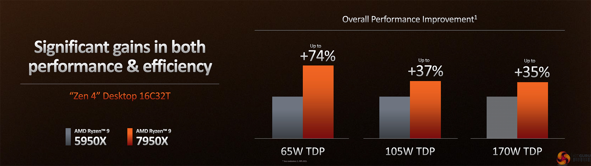 A Watt-for-Watt efficiency comparison that AMD showed between Ryzen 9 5950X and Ryzen 9 7950X was interesting. The data shows up to 35% better performance on the new 16-core processor at 170W TDP. That stays roughly consistent at +37% for 105W TDP. But down at 65W TDP, Ryzen 9 7950X is up to 74% higher performance.
