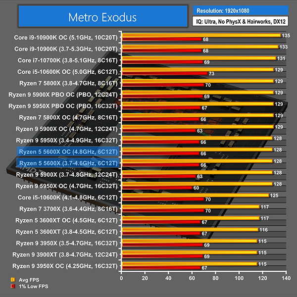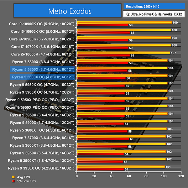 Metro Exodus once again has the 5600X beating its relevant competition, though its lead versus the 10600K is slim when both CPUs are at stock.