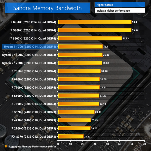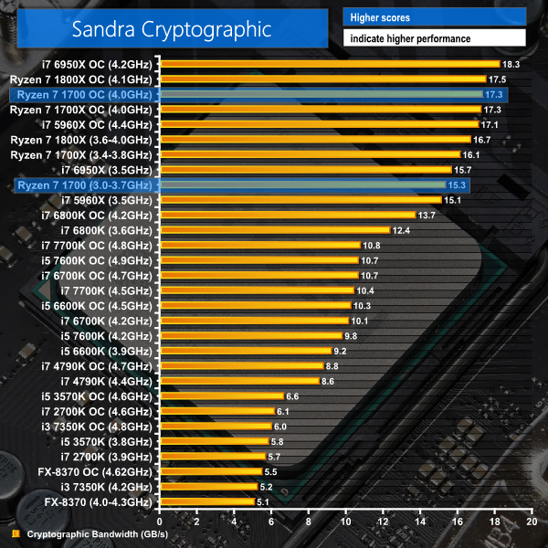 Synthetic performance also shines the 1700 under a positive light. You can extract most of the performance offered by Intel multi-core parts that are significantly more expensive. That's particularly true when overclocking the 1700 to 4GHz, at which point there is no distinguishable difference between it and the £70 more expensive 1700X. Intel's quad-core 7700K is comfortably beaten in Sandra's Arithmetic and Cryptographic tests.