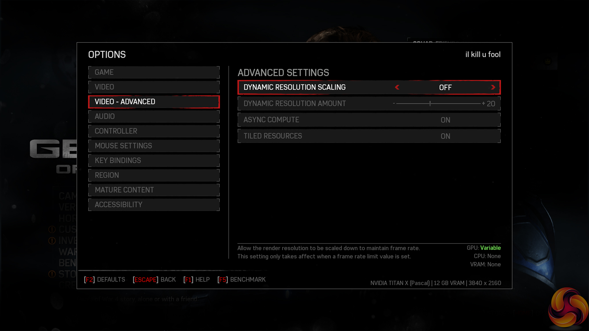 We run the built-in benchmark using a 4K resolution and the same settings as the 1080p test (Ultra quality preset, Async Compute enabled).