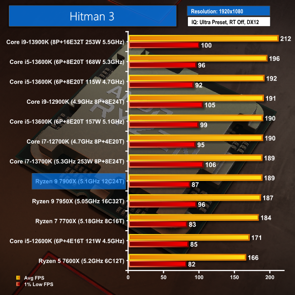Hitman 3 has the 7900X averaging similar to Intel’s Core i7-13700K, but Team Blue’s processor is notably quicker on the 1% Low FPS values.