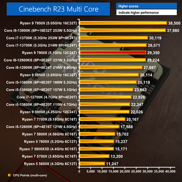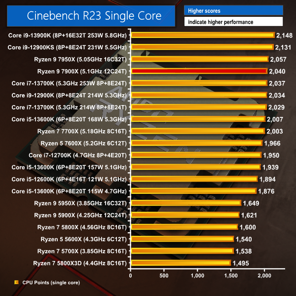 Single-threaded performance on Zen 4 is outstanding, and the Ryzen 9 7900X is no different here. We see a Cinebench 1T score that is only comfortably beaten by the high-clocked Core i9s and AMD’s own Ryzen 9 7950X.