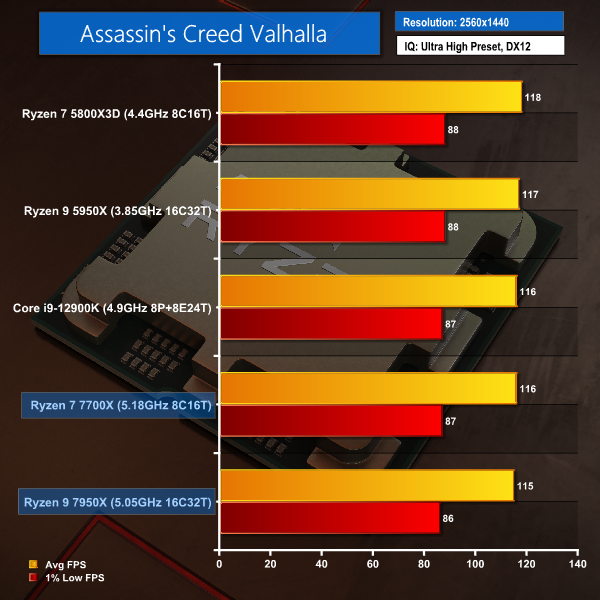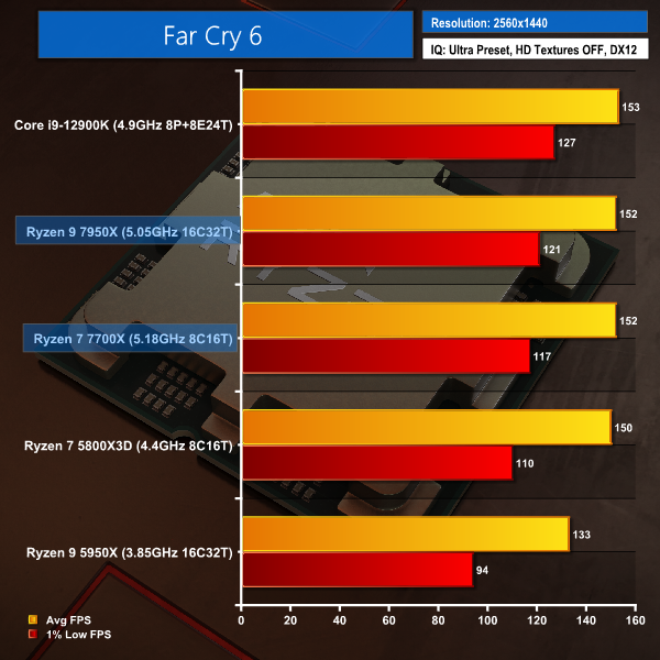 Massive GPU load imparted by the 1440p resolution basically nullifies Intel’s technical advantage in Far Cry 6. With that said, the Core i9-12900K does show tangibly higher 1% low values. As do both Ryzen 7000 chips versus the Ryzen 7 5800X3D.