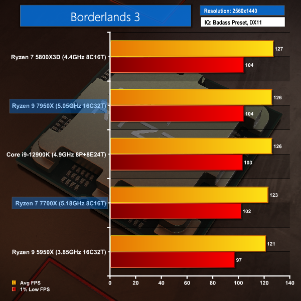 Borderlands 3 shows roughly the same trend, though the three top-tier performers – Ryzen 7 5800X3D, Ryzen 9 7950X, and Core i9-12900K – do look to be slightly better choices.