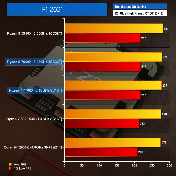 F1 2021 runs at lofty frame rates on a potato, so any of the chips will be absolutely fine here, even though the Core i9-12900K is technically a small percentage behind that Ryzen pack.