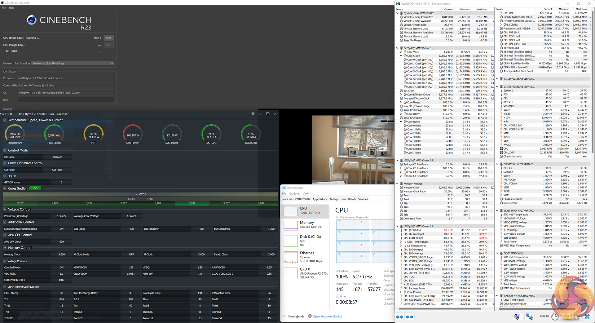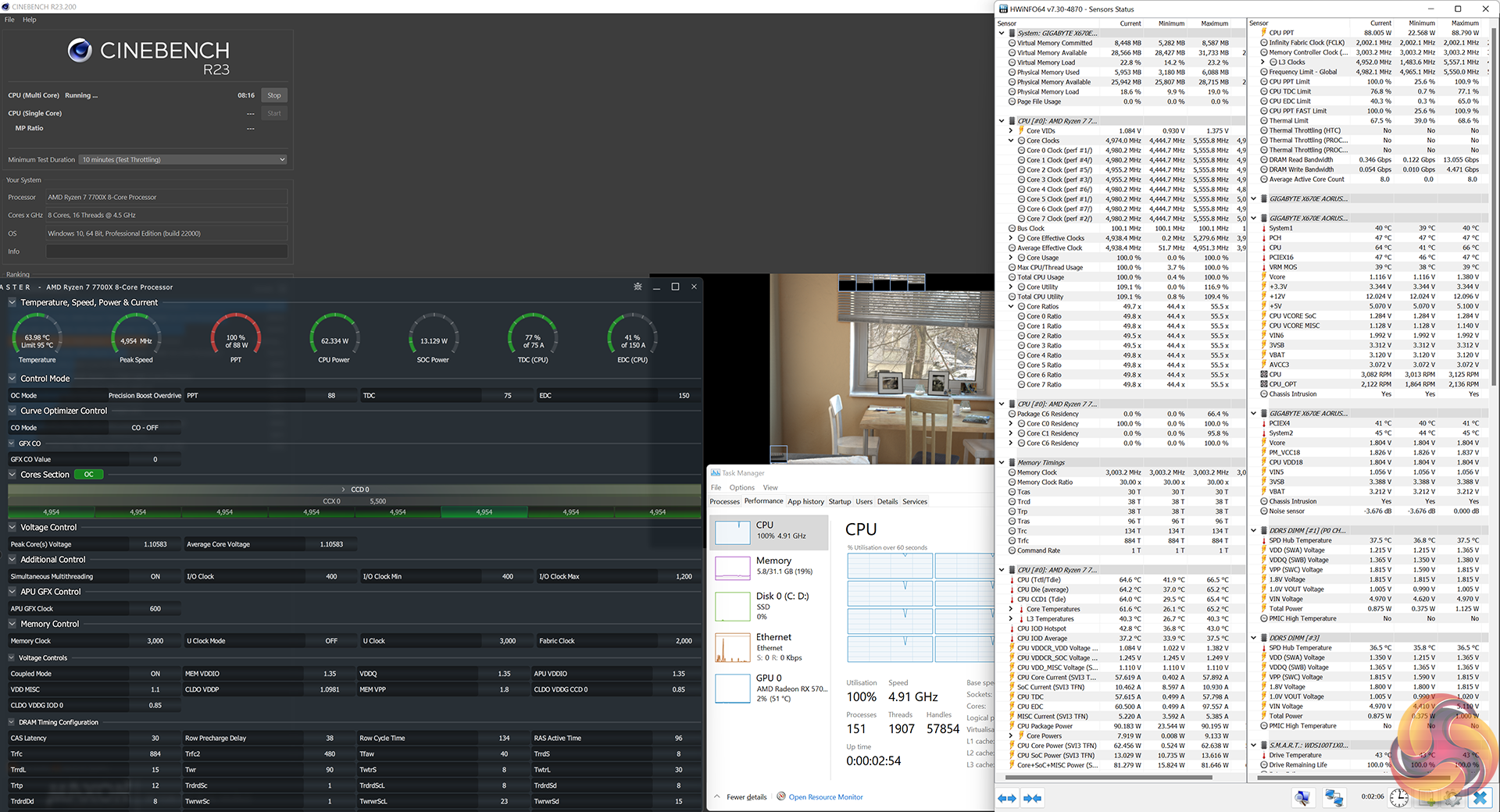 The Ryzen 7 7700X was set to 65W TDP Eco mode, which once again delivered 88W of package power. This resulted in an all-core clock speed of around 4.95GHz – just over a 200MHz drop versus stock settings.