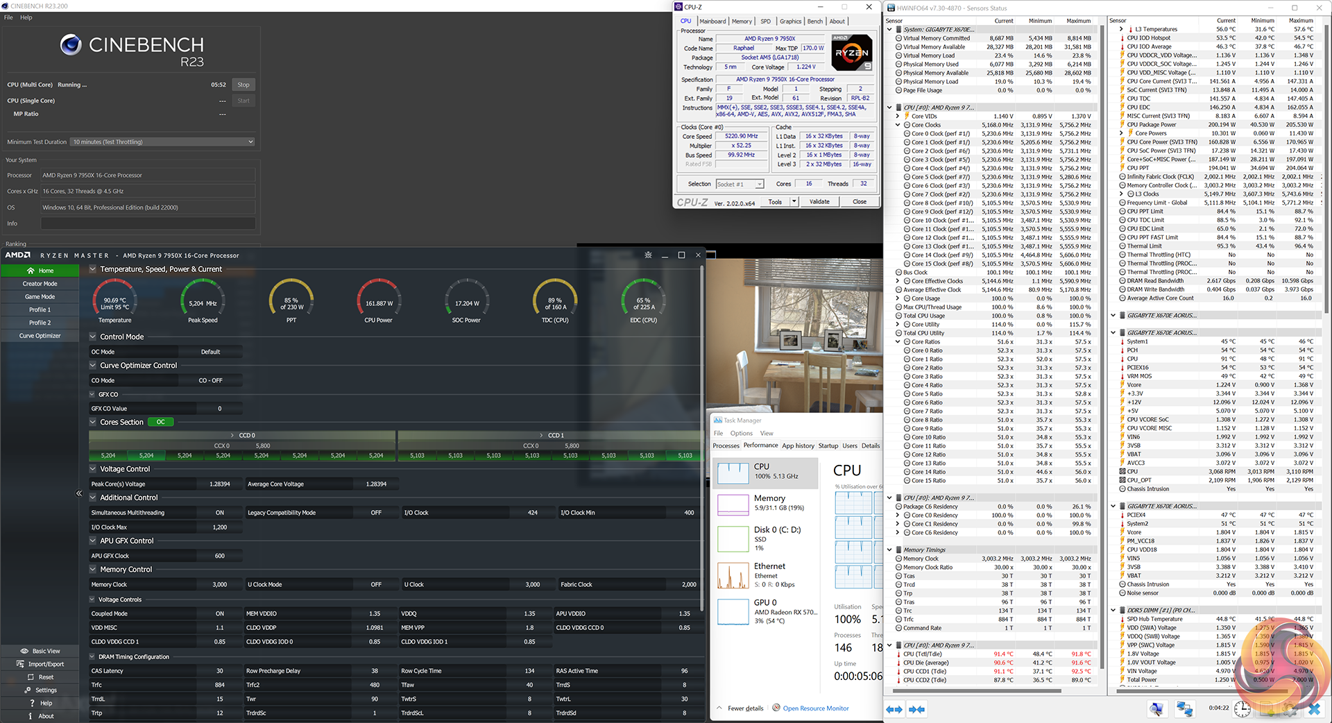 For the Ryzen 9 7950X, this resulted in a frequency uptick of a just under 150MHz during Cinebench all-core loading. The chip now operated slightly below 5.2GHz on all 16 cores.