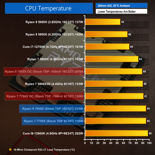 With both Ryzen 7000 processors running at 95C even under stock conditions, we clearly had no real headroom for manual overclocking – we’d already hit our thermal limits.