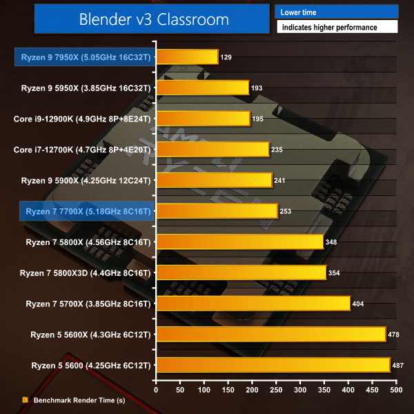 Looking at Blender Classroom rendering performance, the new Ryzen 9 7950X takes a commanding lead at the top of our chart. The next best processors – AMD’s 16-core Ryzen 9 5950X and Intel’s Core i9-12900K – are way behind in this multi-threaded rendering test.