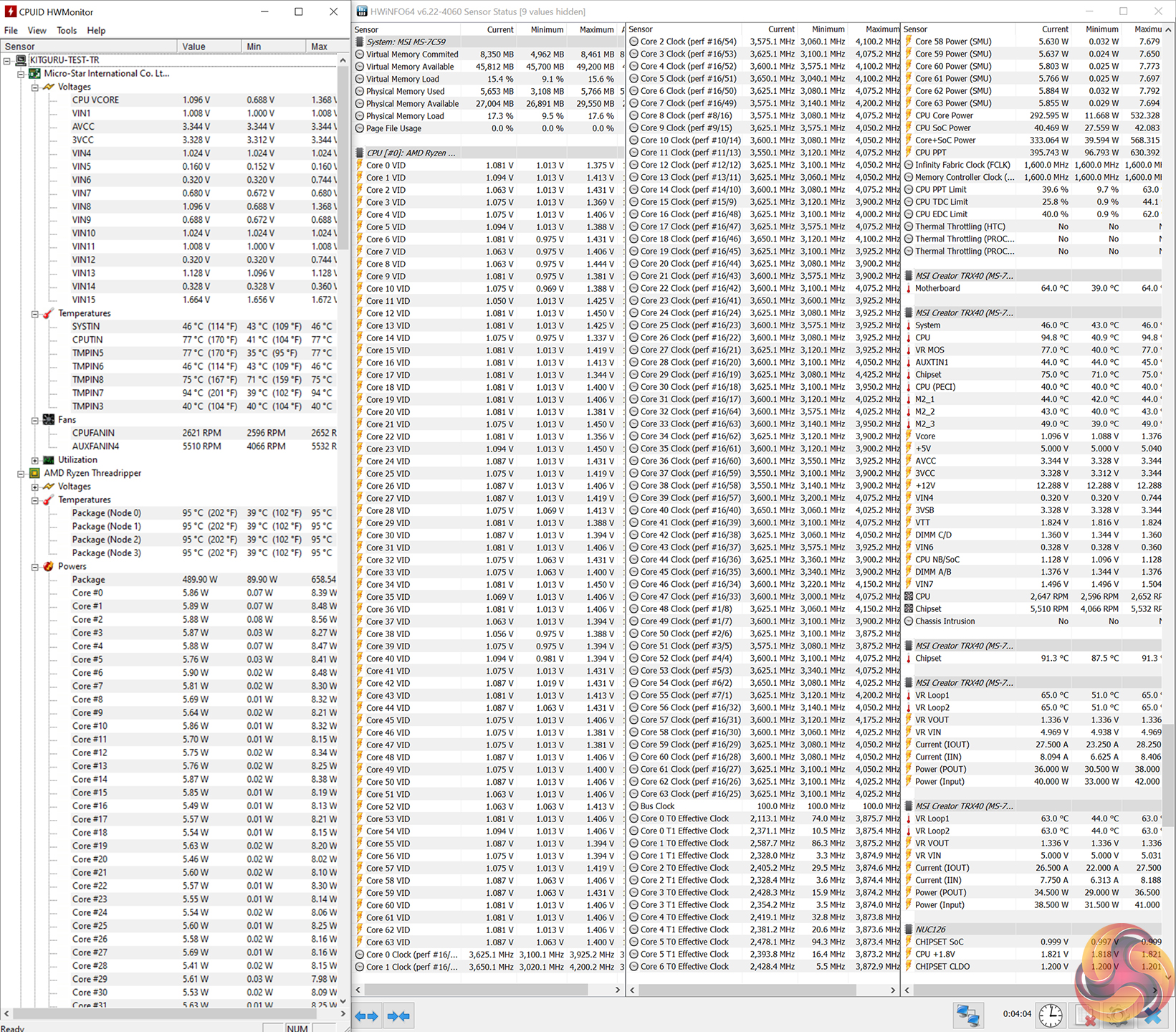 Software-reported CPU package power was in the order of 500W for these readings. However, extended stress tests running towards the 1-hour mark saw the delivered package power drop to around 400-450W in order to stick to the 95°C target.