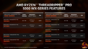AMD rates each Threadripper Pro with a beefy 280W TDP. That translates into maximum boost clocks of 4.5GHz on even the flagship 64-core model. Though sustained all-core loaded clocks will obviously be lower, depending on the Precision Boost 2 algorithms dynamic preferences.