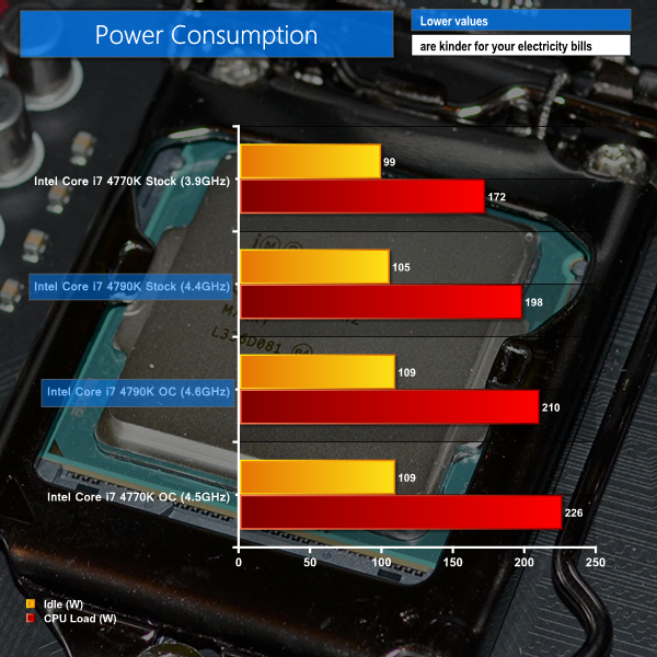 As is to be expected with its increased operating voltage, the stock-clocked Devil's Canyon also dictates greater power delivery when loaded. The improved overclocking capability of our 4790K, in comparison to the retail 4770K, helps to reduce voltage requirements and therefore power consumption levels when overclocked.