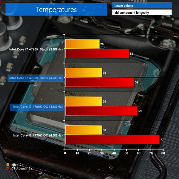 The eagle-eyed amongst you will notice that our idle power consumption numbers for the 4770K are different to those recorded in our motherboard reviews. This is a minor issue that we are looking into and does not affect the legitimacy of the recordings displayed above (the same test system was used for all power and temperature recordings).