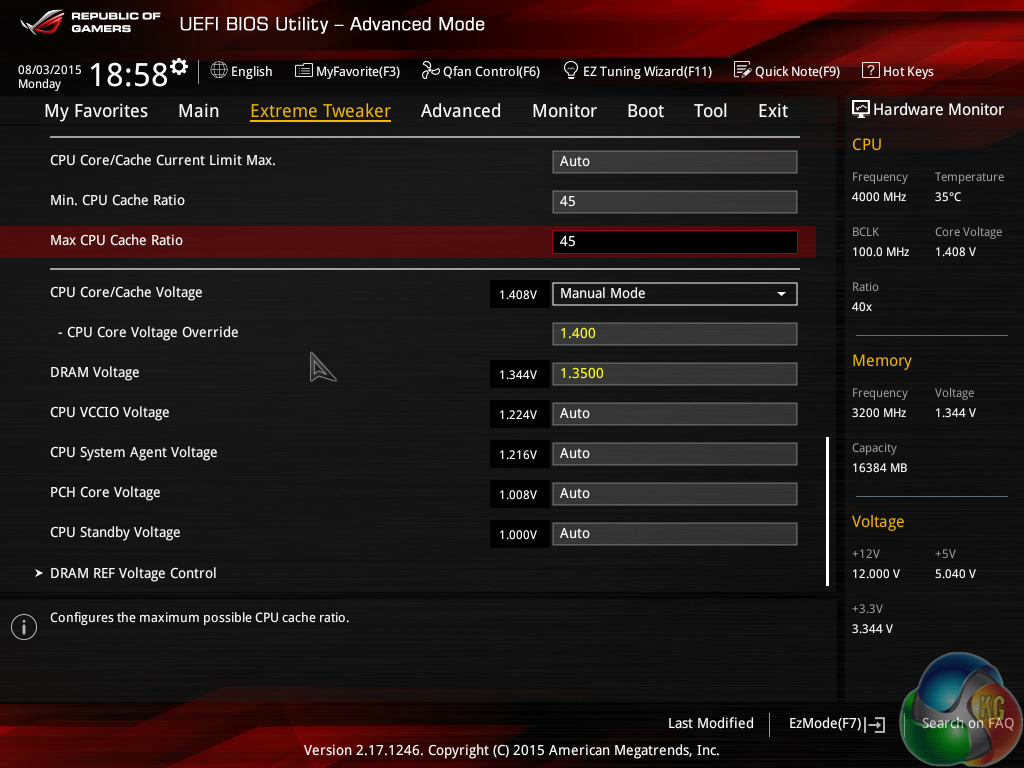 We accepted the frequency limit of 4.5GHz and were able to dial down CPU core voltage to 1.35V. CPU cache frequency was set at 4.5GHz.