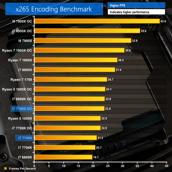 The Core i7-7740X's performance in our CPU-heavy, multi-threaded benchmarks is unsurprising. A slight frequency bump over the 4C8T 7700K allows the 7740X to offer slight performance improvements in all circumstances (1.9% in Cinebench, 1.5% in Handbrake, and 2.4% in x265 encoding). However, compared to the similarly-priced Ryzen 7 1700, Intel's quad-core processor is well-and-truly beaten when focussing on multi-threaded performance.