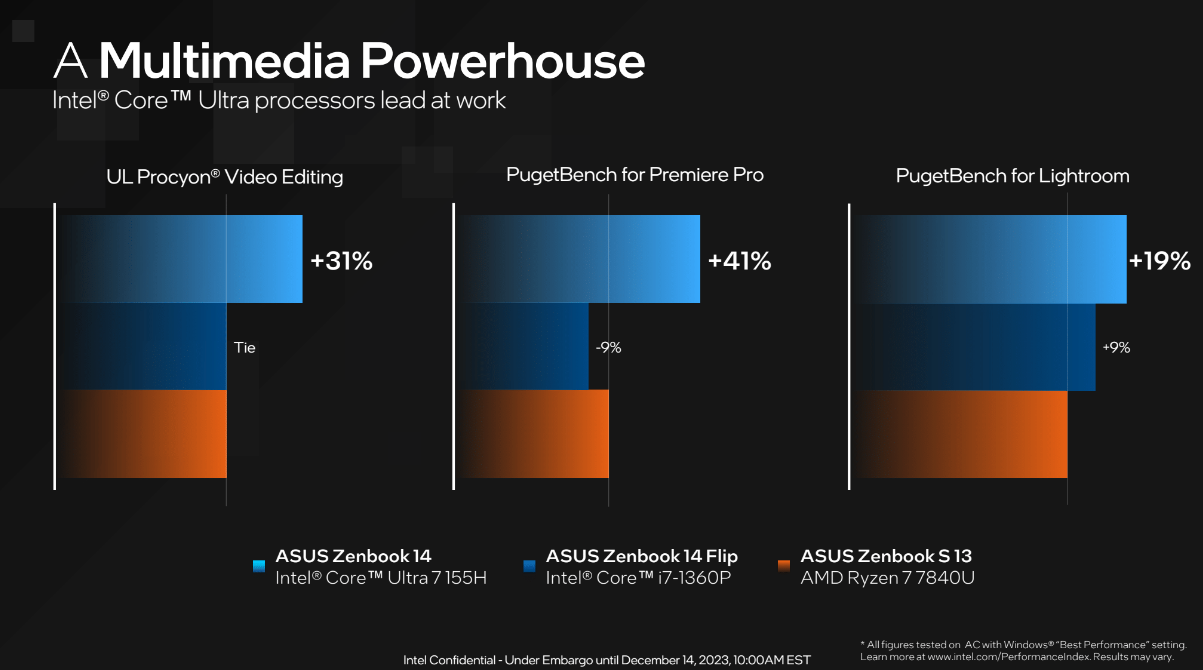 Versus the current-gen Ryzen 7 7840U, Intel claims to have leads in both single-threaded and multi-threaded workloads with its new Intel 4 node. In a set of benchmarks, we can see Intel's Core Ultra 7 155H taking the lead in PugetBench for Premiere Pro, PugetBench for Lightroom and UL Procyon Video Editing.