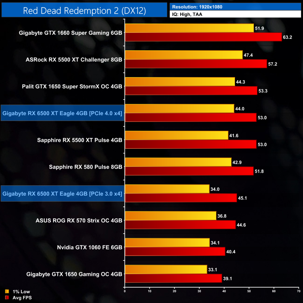 Then we have Red Dead Redemption 2 with yet more lacklustre performance, the 6500 XT delivers the same average frame rate as the 1650 Super and 5500 XT 4GB, two cards that both launched for less money over 2 years ago. And of course, PCIe 3.0 just makes things worse, this time by 15% on average, with performance now equal to the RX 570.