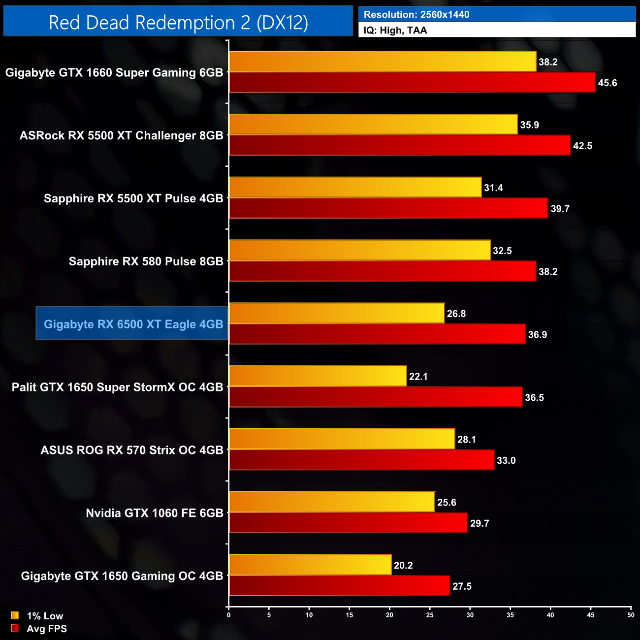Then we have Red Dead Redemption 2 with yet more lacklustre performance, the 6500 XT delivers the same average frame rate as the 1650 Super and 5500 XT 4GB, two cards that both launched for less money over 2 years ago. And of course, PCIe 3.0 just makes things worse, this time by 15% on average, with performance now equal to the RX 570.