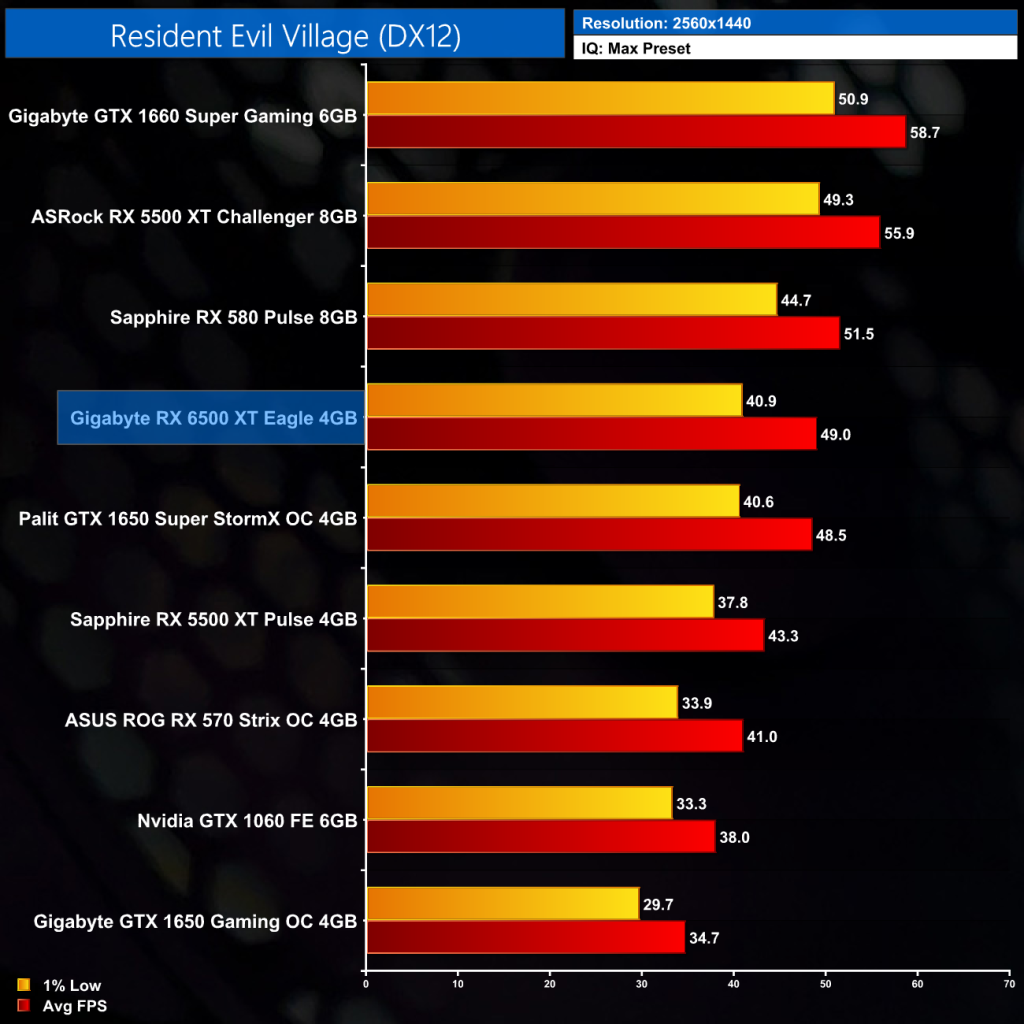 It’s more of the same in Resident Evil Village, where the RX 580 is actually faster than the 6500 XT out of the gate, with performance also on par with the 1650 Super. Tested with PCIe Gen3 however, performance drops to below even the GTX 1060, and it isn’t much ahead of the GTX 1650 at all.