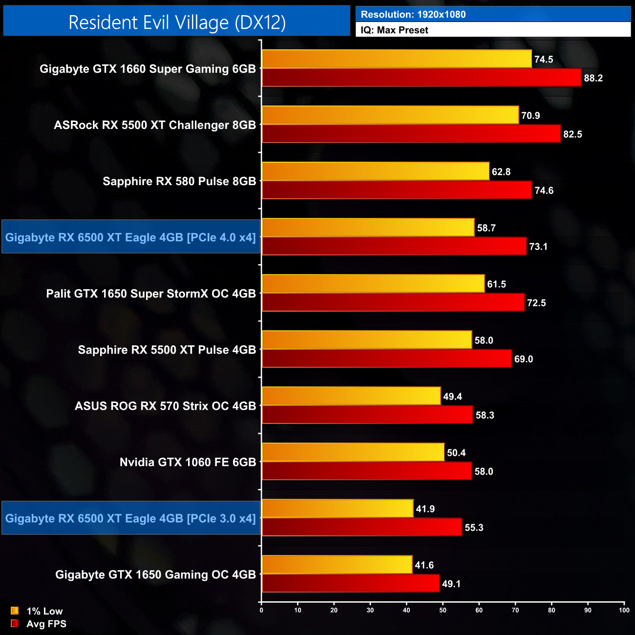 It’s more of the same in Resident Evil Village, where the RX 580 is actually faster than the 6500 XT out of the gate, with performance also on par with the 1650 Super. Tested with PCIe Gen3 however, performance drops to below even the GTX 1060, and it isn’t much ahead of the GTX 1650 at all.