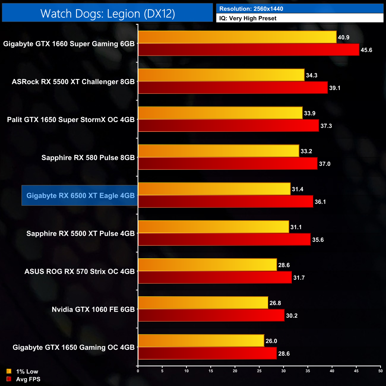 Lastly, we finish up the benchmarks with Watch Dogs: Legion, and by now it won't come as a surprise that the 6500 XT is delivering disappointing results. At best, it’s still slower than the 1650 Super by a couple of frames, but at worst – when using PCIe 3 – it is slower than the RX 580 and just as fast as a 5500 XT 4GB.