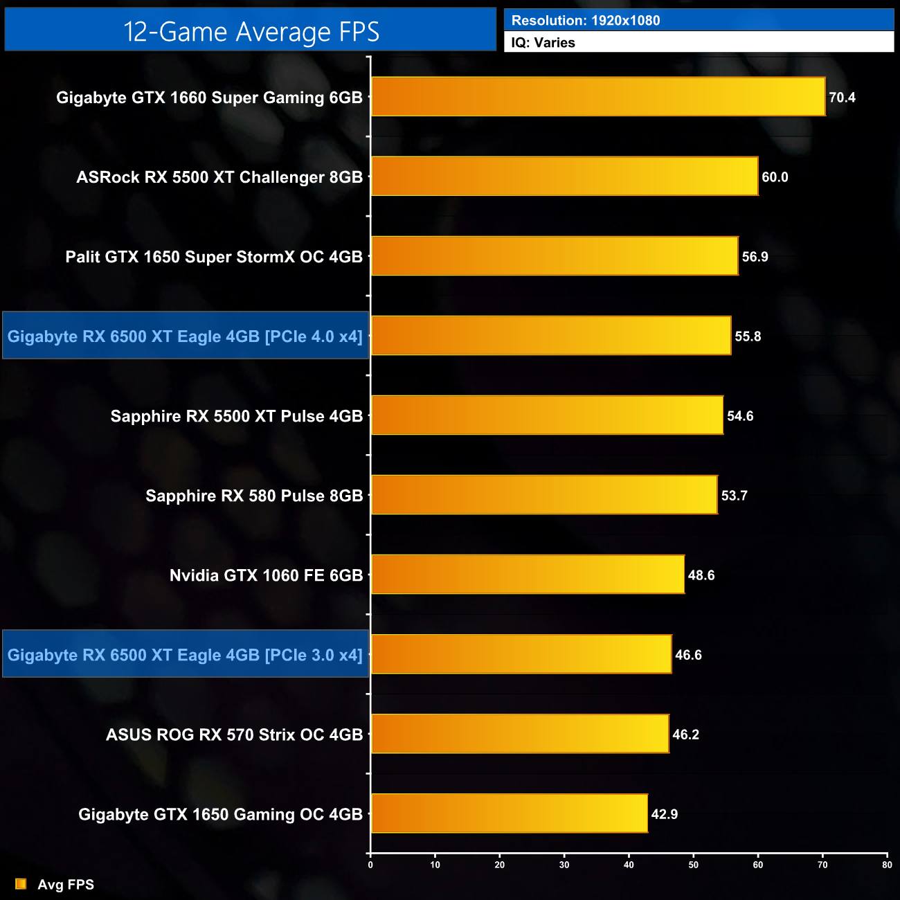 Taking a look at average performance then across all twelve games we tested, we'll start by talking about the RX 6500 XT on PCIe 4.0. Even in that best case scenario, it's a very disappointing release – performance is worse than the GTX 1650 Super which launched in 2019 for £150, and it's basically the same as the RX 5500 XT 4GB. We're only looking at a 4% boost over the RX 580, a card that hit the market in 2017 (and was basically just a re-released RX 480 from 2016), and frankly that's such a negligible difference it that I'd call the two effectively as fast as each other.