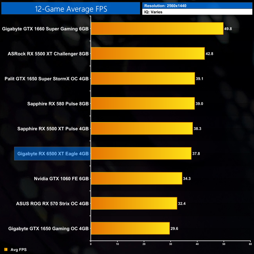 For a quick look at 1440p performance, this is really just a ‘bonus' chart as the 6500 XT is not designed for anything above 1080p. The average frame rate is not great and not shown are the 1% low figures, which also suffered at the higher resolution.