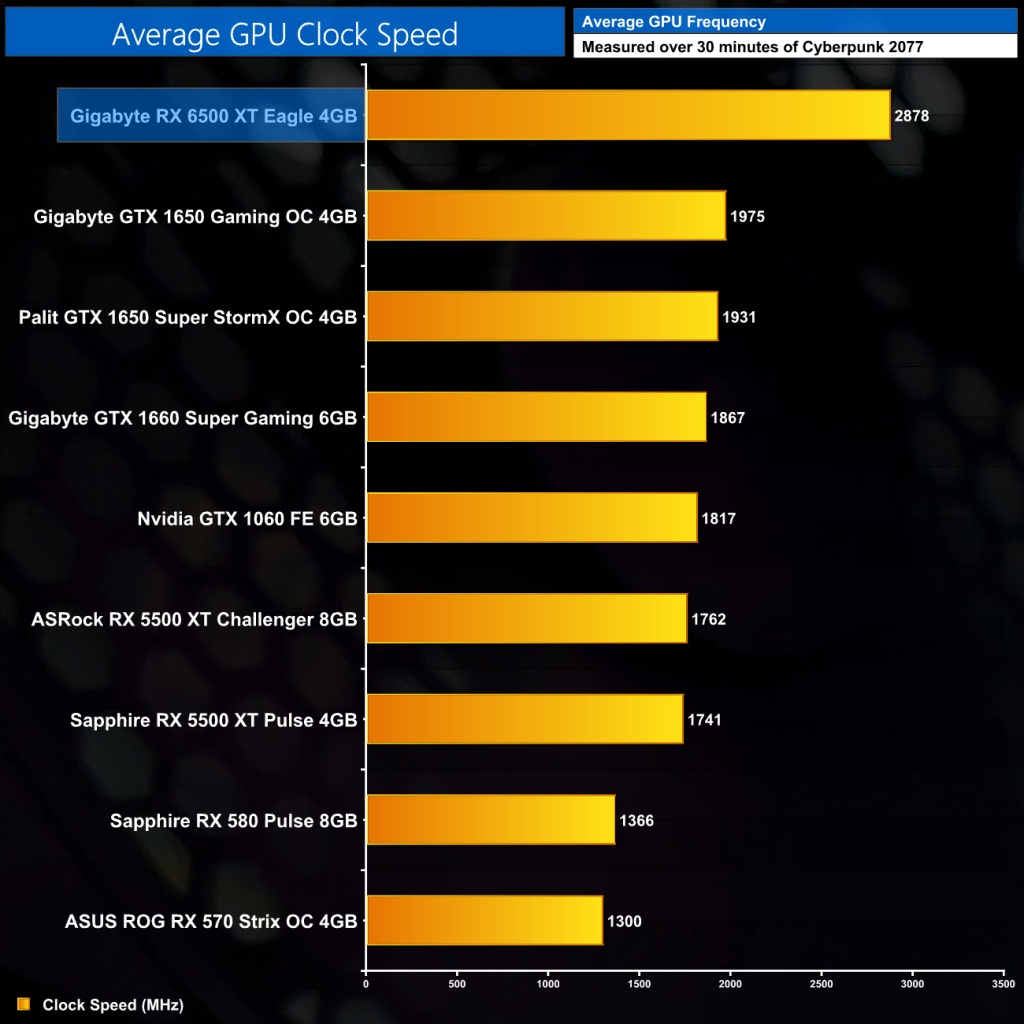Here we present the average clock speed for each graphics card while running Cyberpunk 2077 for 30 minutes. We use GPU-Z to record the GPU core frequency during gameplay. We calculate the average core frequency during the 30 minute run to present here.
