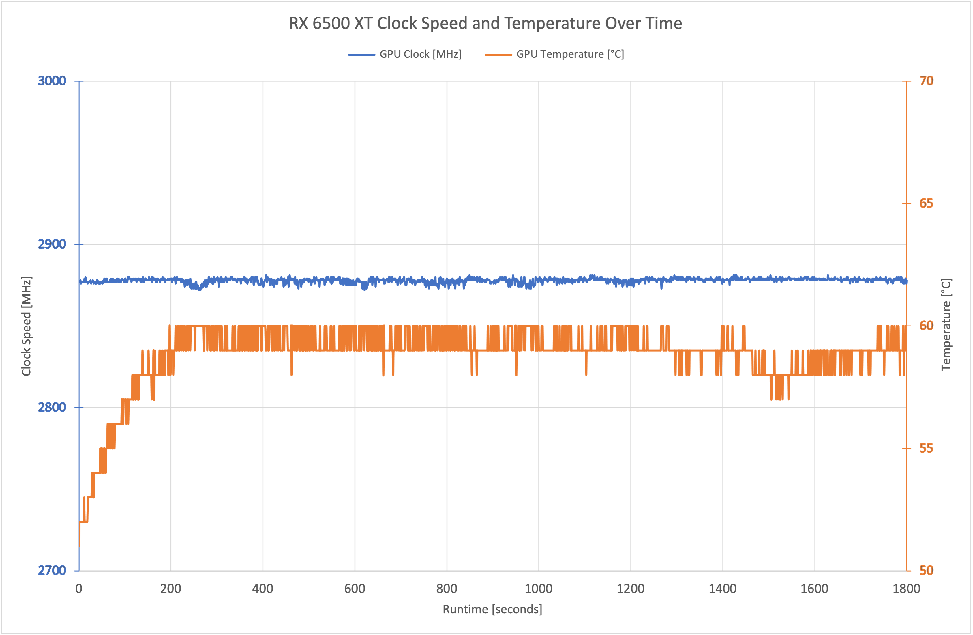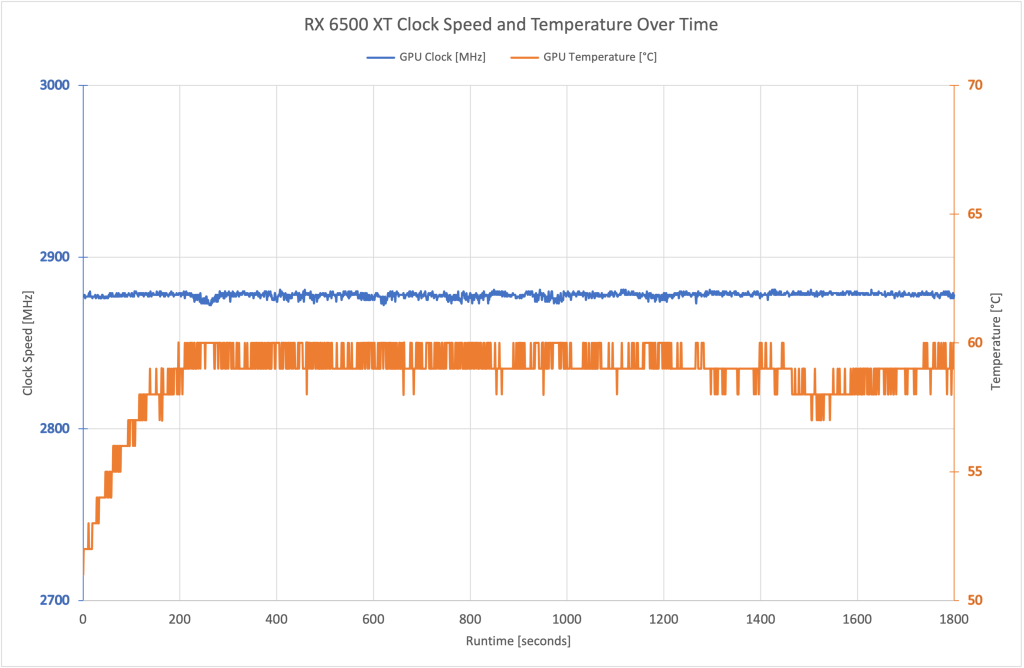 Moving onto our technical tests, one area of note for the RX 6500 XT is its very high clock speeds. The Gigabyte RX 6500 XT Eagle that we tested did very well here, offering incredibly stable clock speeds – it averaged 2878MHz over our 30-minute stress test, with absolutely minimal fluctuation in frequency, as can be seen above.
