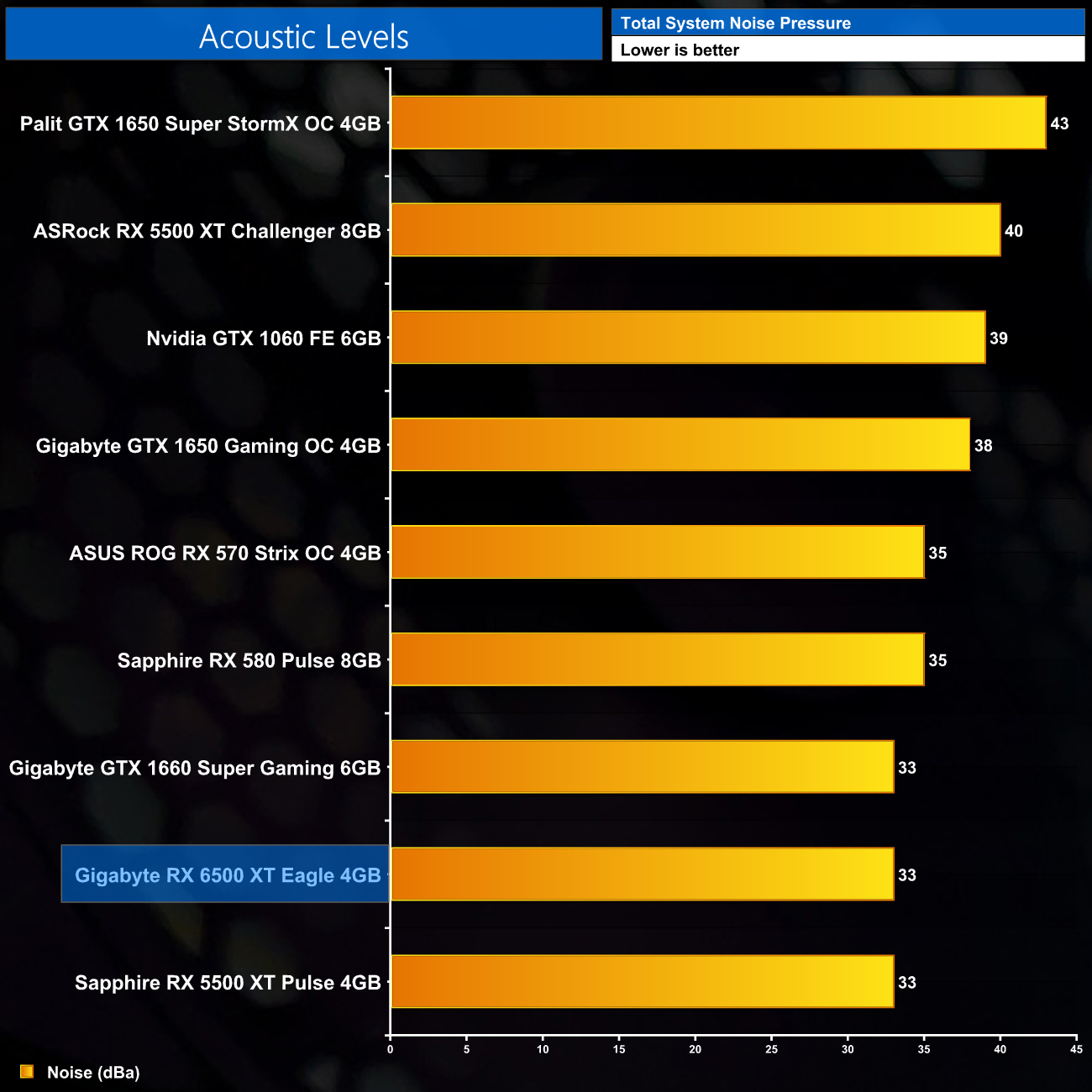We take our noise measurements with the sound meter positioned 1 foot from the graphics card. I measured the noise floor to be 32 dBA, thus anything above this level can be attributed to the graphics cards. The power supply is passive for the entire power output range we tested all graphics cards in, while all CPU and system fans were disabled. A reading under load comes from running Cyberpunk 2077 for 30 minutes.