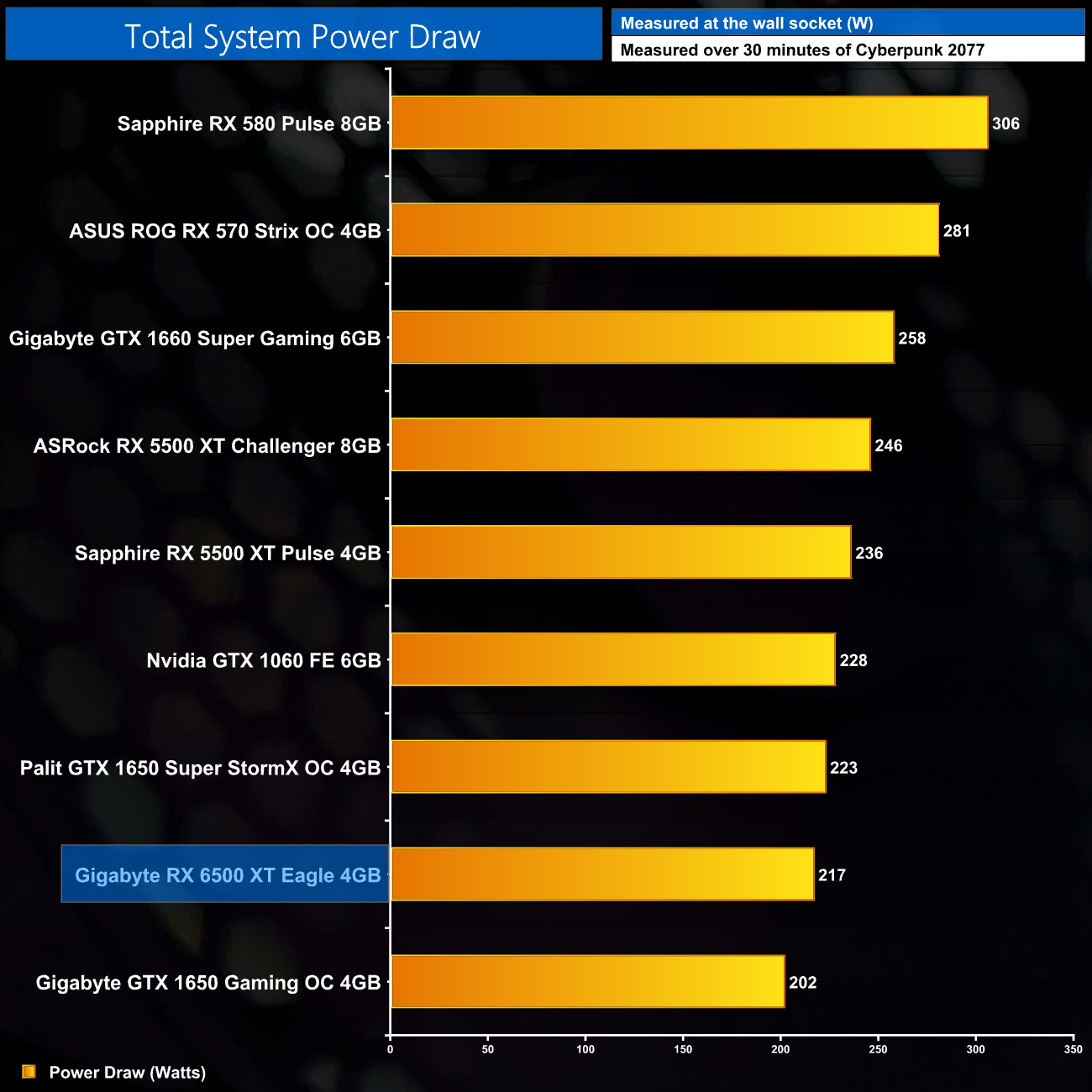 We measure system-wide power draw from the wall while running Cyberpunk 2077 for 30 minutes.