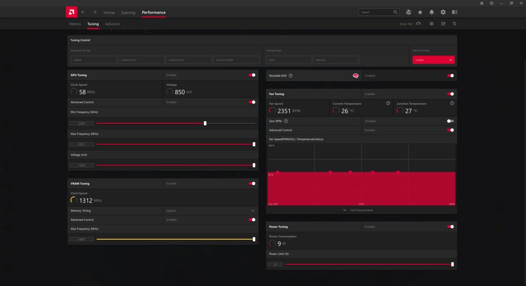 Interestingly, AMD has capped both the GPU and memory frequency sliders, to 2975MHz and 2400MHz respectively. I was able to put both sliders at their maximum values without instability.